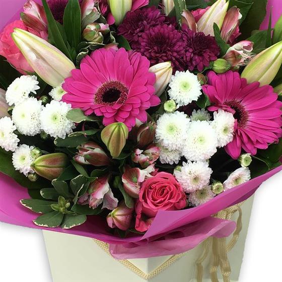 This elegant bouquet blends budding oriental lilies, cerise gerberas, pink alstroemeria, spray roses, white button chrysanthemums and deep plum blooms, beautifully presented for a charming, sophisticated gift.