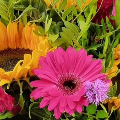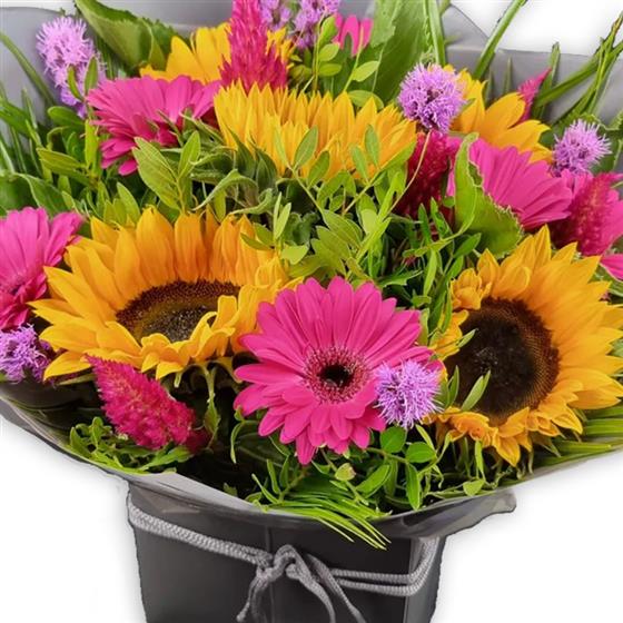 Golden sunflowers paired with vibrant pink gerberas, soft purple liatris and trailing greenery, bringing a tender, sunlit embrace to any room.