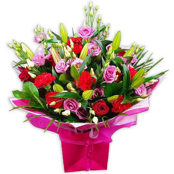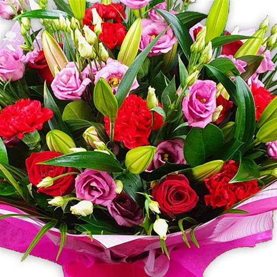 Blush pink lisianthus, scarlet carnations, deep-red roses and tender lilies nestle in verdant foliage, wrapped in soft tissue for a gentle, romantic flourish.