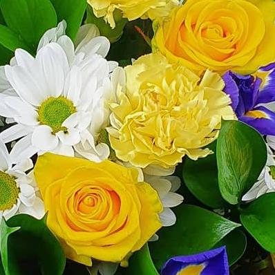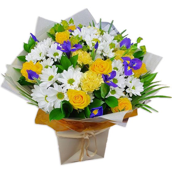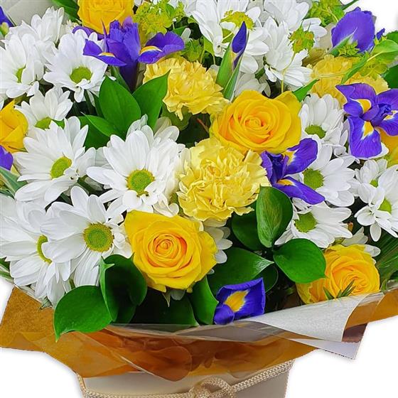 Ivory daisies, soft yellow roses and light carnations dance with purple iris petals amid lush green leaves for a whisper-soft, cheerful flourish.