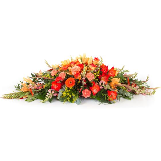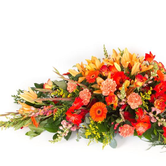 A vibrant family tribute of deep oranges and rusts including roses, lilies, mini gerberas, carnations and antirrhinum interspersed with golden solidago.