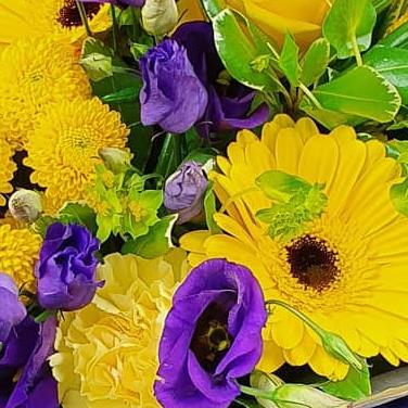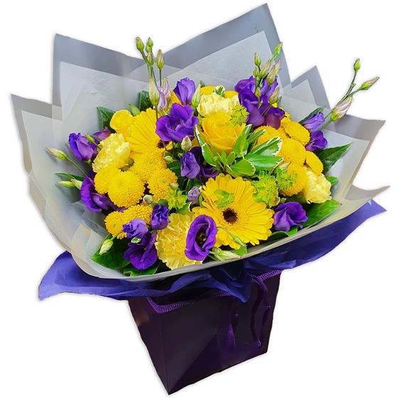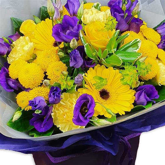 A vibrant hand-tied bouquet combining yellow gerberas, yellow roses, button chrysanthemums, purple lisianthus and soft green foliage, creating a bold, uplifting mix with strong colour contrast and a fresh, modern finish.
