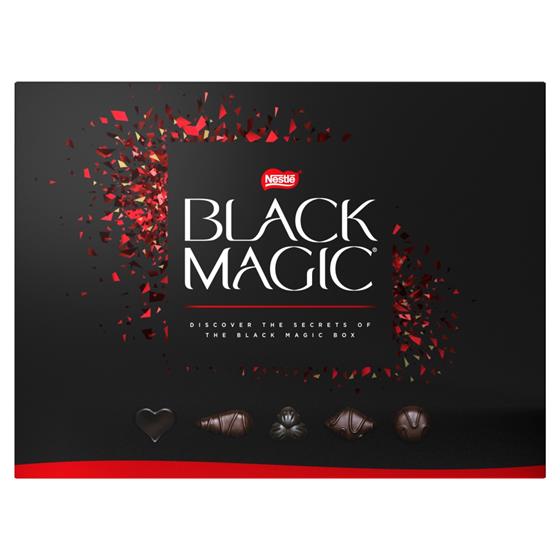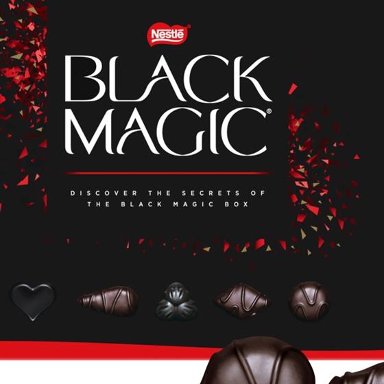 Enjoy Black Magic; a selection of dark chocolates in a variety of caramels, nuts and fruit creams, wrapped in dark chocolate.