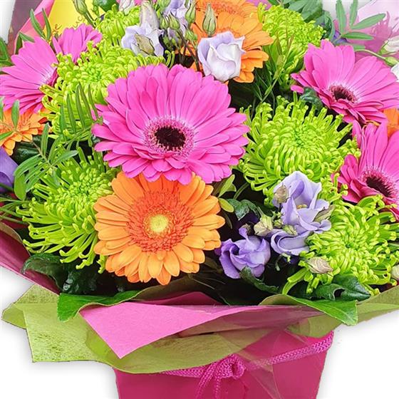 Fresh, vibrant, bold seasonal bouquet featuring hot pink and tangerine gerbera daisies, chartreuse spider chrysanthemums, delicate lavender lisianthus, crisp green hypericum berries and lush foliage, vibrant and bold.