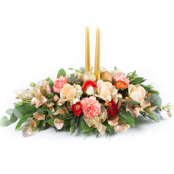 An elegant gold, cream and peach table centre arrangement.