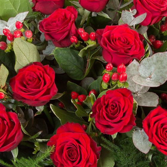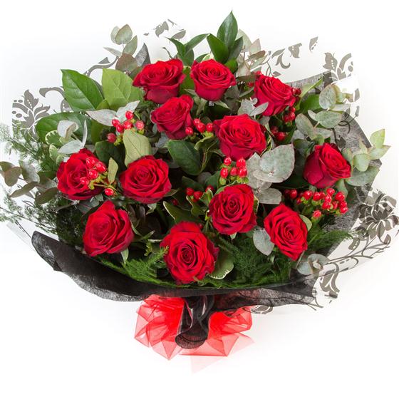 12 long stemmed velvety red roses mingled with mixed foliage and hypericum berries, presented with a complementary wrap.