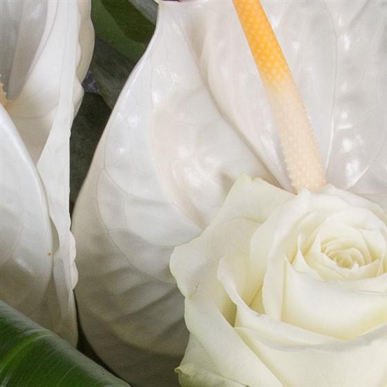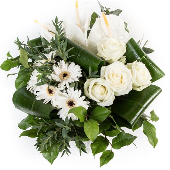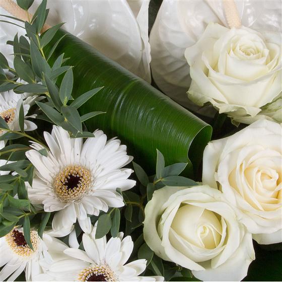 This sectioned hand-tied bouquet combines white anthuriums, gerberas and roses to create a stunning display. Available with a hand-tied vase as pictured or delivered in water.
