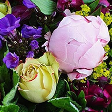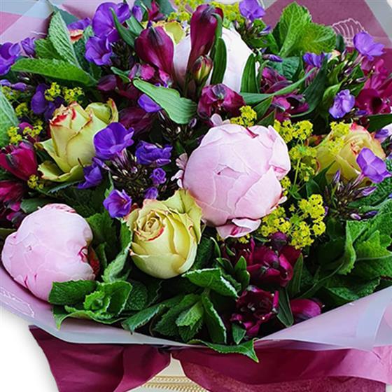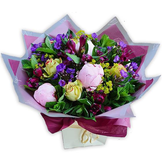This bouquet features soft pink peony, cream and crimson roses, deep burgundy alstroemeria, purple stock, golden yarrow and fresh mint foliage—elegantly wrapped in paper for a gently enchanting gift.