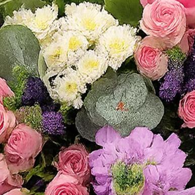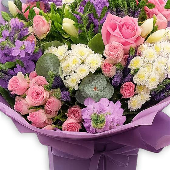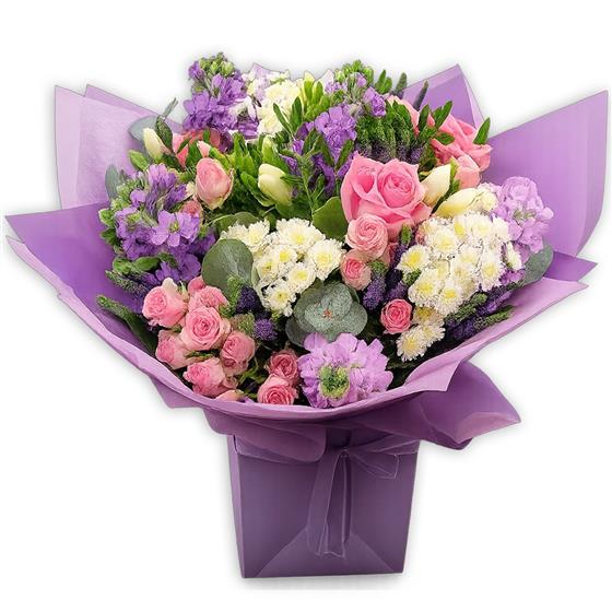 A charming mix of pink roses, lilac stocks, white spray chrysanthemums, lisianthus and eucalyptus. Hand-arranged in soft lilac wrap for a fresh, spring-fresh finish.