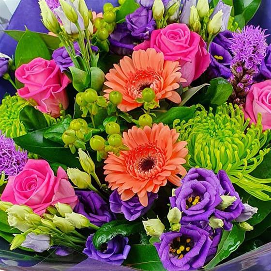 A bold mixed flower arrangement featuring roses, gerbera, lisianthus, chrysanthemums, hypericum berries and seasonal foliage. Strong colour contrasts and varied textures combine to create a lively, modern design with real visual impact.