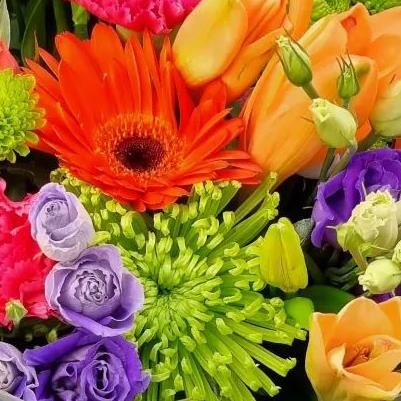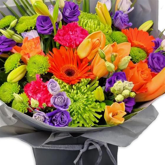 Design includes orange gerbera, orange roses, yellow tulips, purple lisianthus, green chrysanthemum blooms, pink carnations and mixed foliage, brought together in a lively, high-energy bouquet packed with colour, texture and playful contrast.