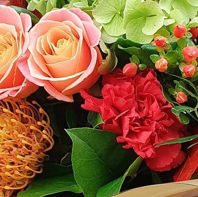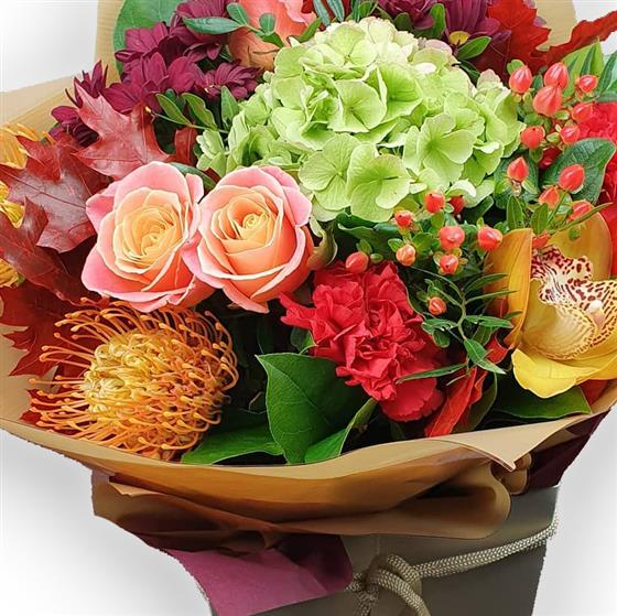 Design includes peach roses, fresh green hydrangea, rich red carnations, golden pincushion protea, seasonal berries, autumnal foliage and mixed textures, arranged into a full, characterful bouquet with warm tones, depth and a softly seasonal, uplifting feel.