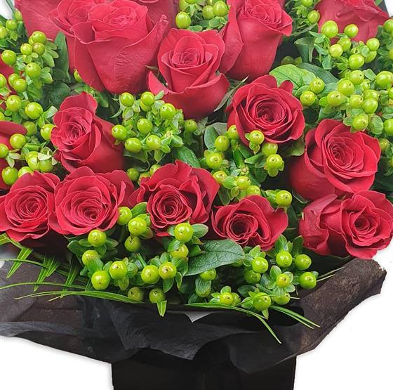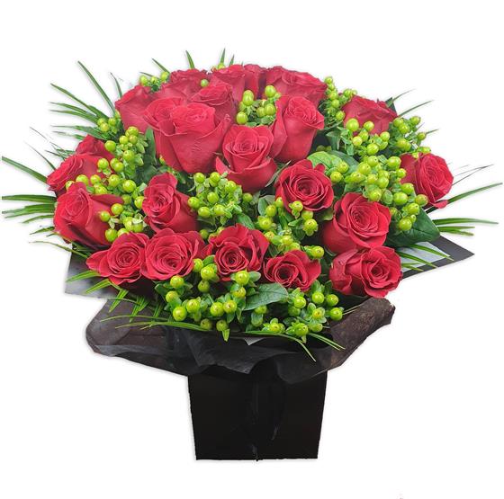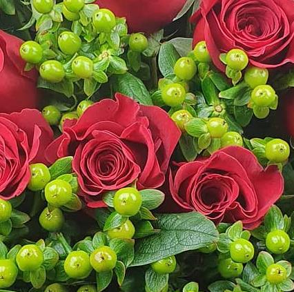 A striking, full-bodied flower bouquet built around rich red roses and fresh green berries. Balanced, confident and timeless, this design delivers impact with depth and clean structure.