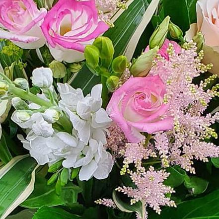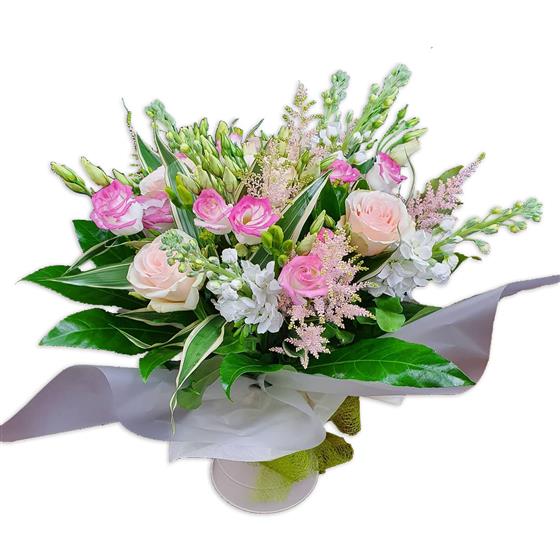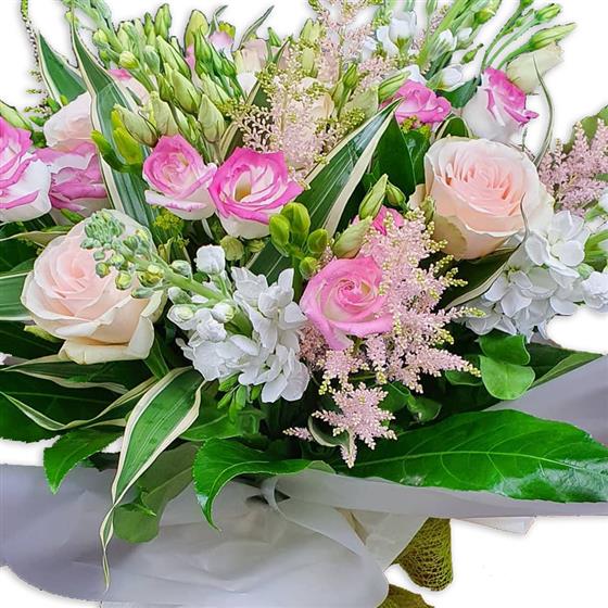 A softly styled bouquet designed with blush and pink roses, white stocks, astilbe, seasonal buds and fresh green foliage, finished with light structure and natural movement for an elegant, calm floral look.