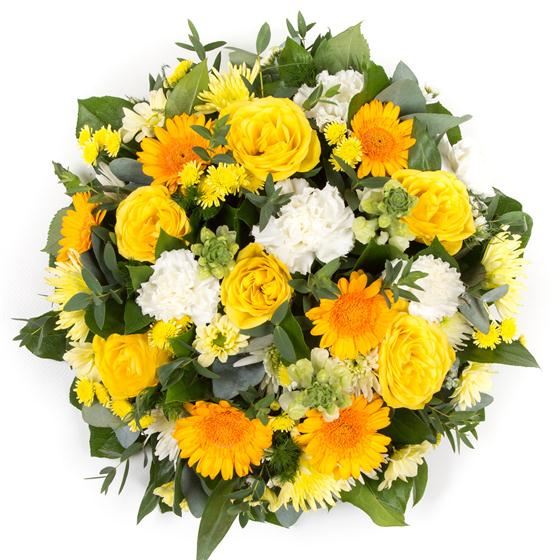This colourful posy arrangement mixes gold roses and mini gerberas with lemon spray chrysanthemums, antirrhinums and white carnations.