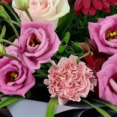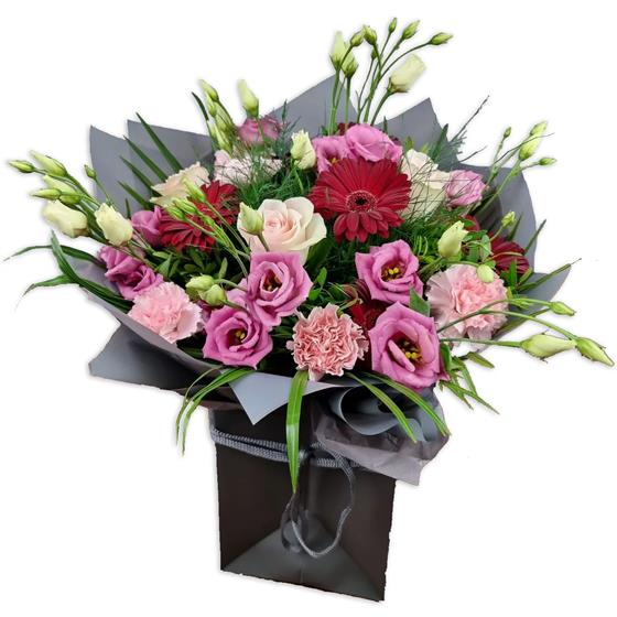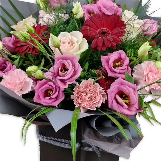 A rich, elegant flower bouquet blending soft pinks with deep red highlights. Designed using roses, gerberas, lisianthus and carnations, finished with flowing greenery for movement and depth. Stylish, balanced and full of texture.