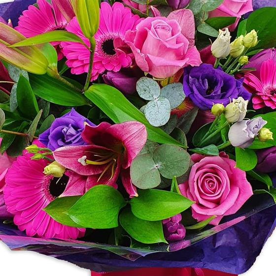 Design includes bright pink gerbera, pink roses, purple lisianthus, pink oriental lily blooms and buds, eucalyptus foliage and fresh green leaves, arranged into a bold, contemporary bouquet with strong colour, texture and lively movement.