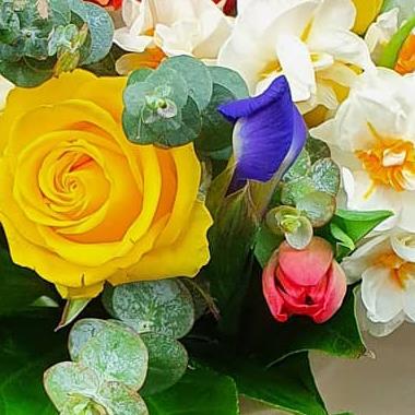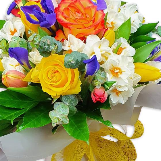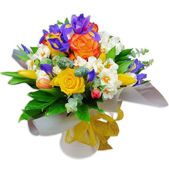 A lively spring flower arrangement featuring roses, irises, tulips and narcissi, layered with eucalyptus and fresh foliage. Warm orange and yellow tones are balanced with crisp white blooms for a bright, uplifting finish.