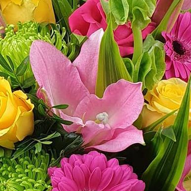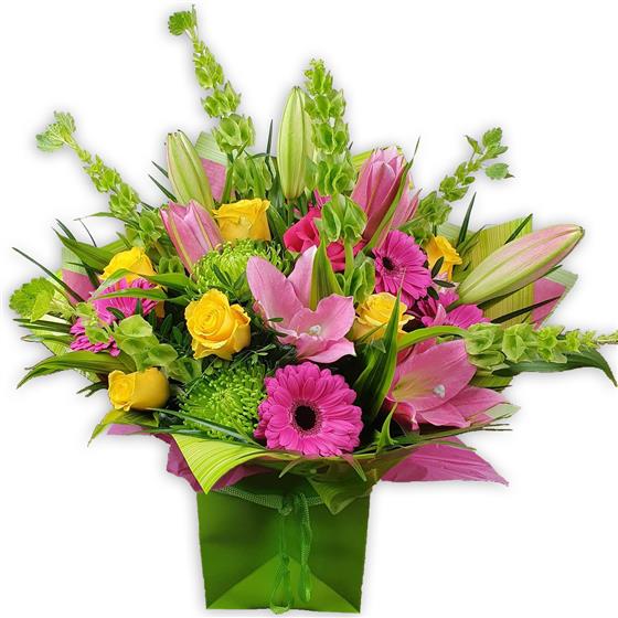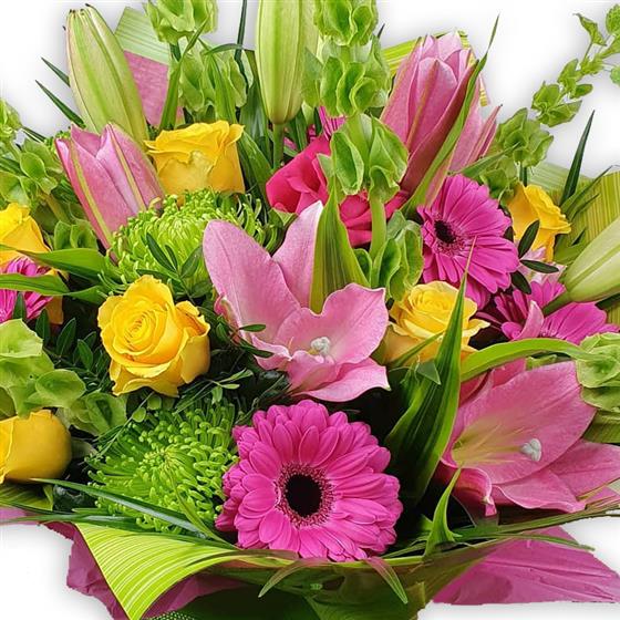 Vibrant arrangement featuring pink oriental lilies, golden yellow roses, hot pink gerbera daisies, chartreuse spider chrysanthemums, Bells of Ireland, delicate pink alstroemeria accents, and lush green foliage, gift-wrapped.