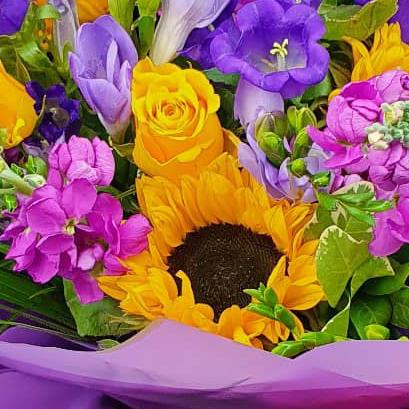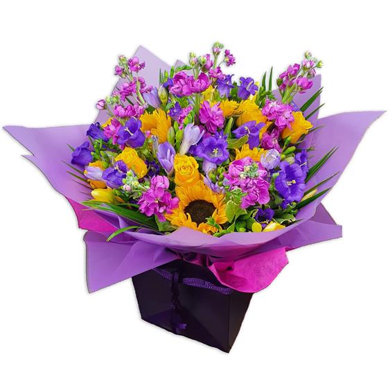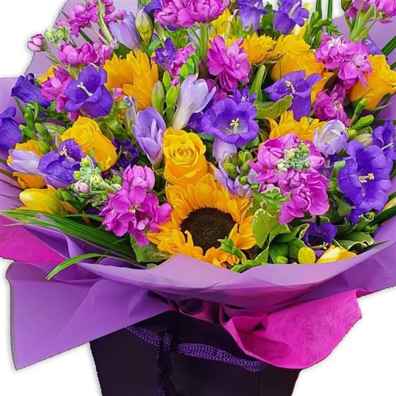 Design includes bright sunflower, yellow roses, purple lisianthus, lilac freesia, pink stock and mixed seasonal foliage, brought together in a joyful, colour-rich bouquet full of movement, texture and feel-good energy.