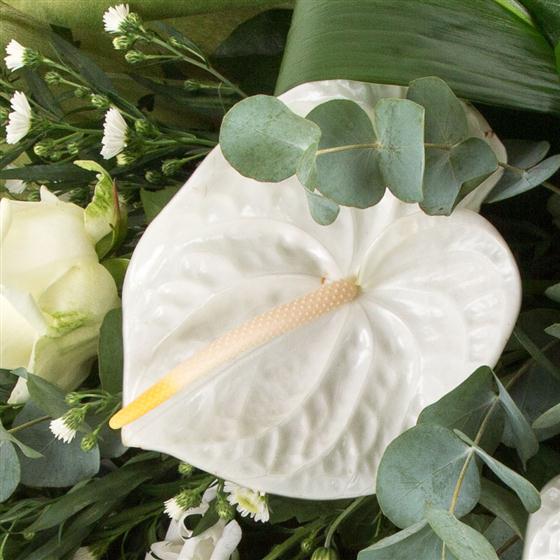 A simple combination of cream and white blooms and unusual greens. Anthuriums, lilies and roses are included in this stylish bouquet.