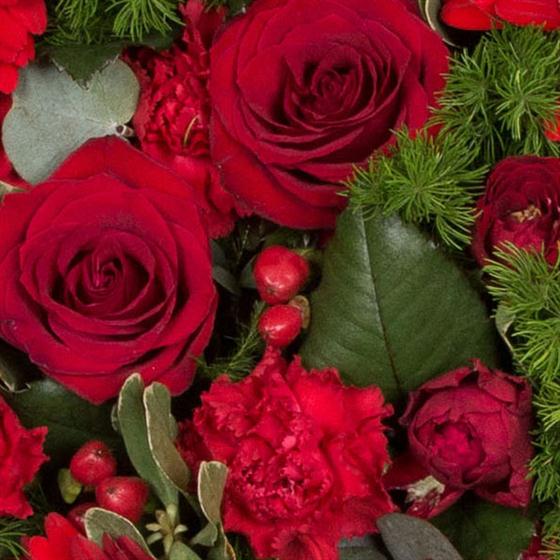 This striking red heart is created using a combination of seasonal foliage, hypericum berries and all red blooms.