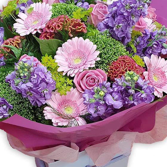 Soft pastel roses and pink gerberas are paired with lavender stock, lime viburnum balls and coral cockscomb, nestled in fresh greenery for an airy, gentle flourish.