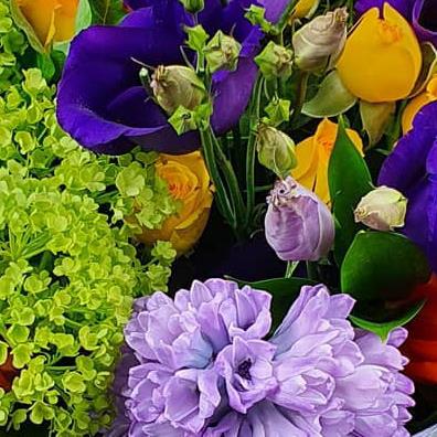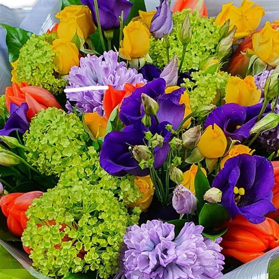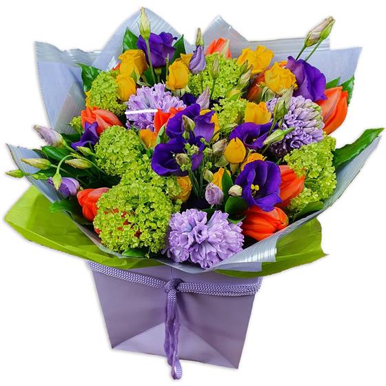 Design includes green viburnum-style blooms, lisianthus, tulips, roses and layered seasonal flowers in strong contrasting tones, arranged into a lively bouquet with depth, texture and a confident, modern feel.