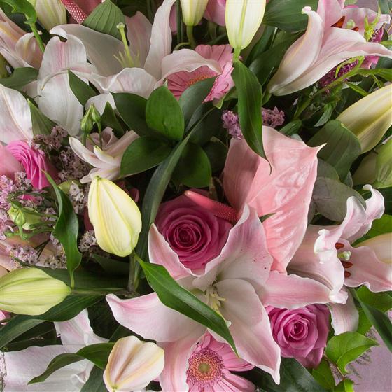 A sophisticated array of fragrant pink lilies, lime foliage, anthuriums and roses make this a stylish choice.