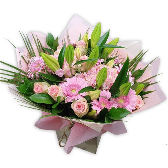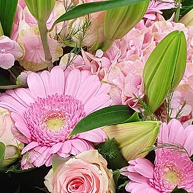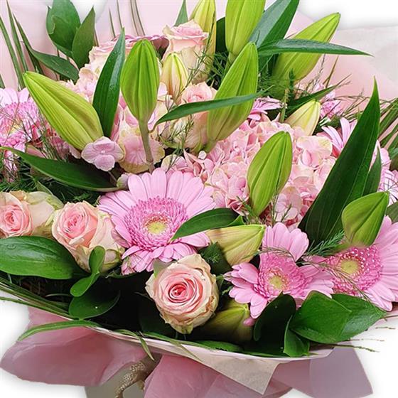 Soft pink roses and gerberas nestle alongside lilies in vibrant greenery, offering delicate, feminine charm.