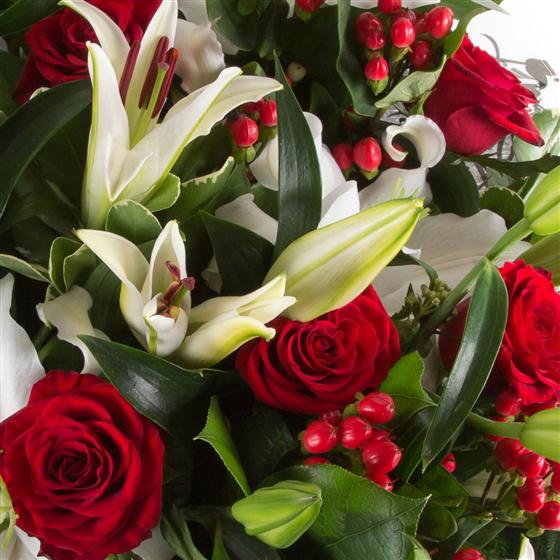 An beautiful display of highly fragranced white lilies and fabulous red roses mingled with a variety of foliage.