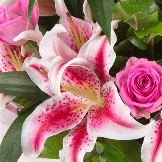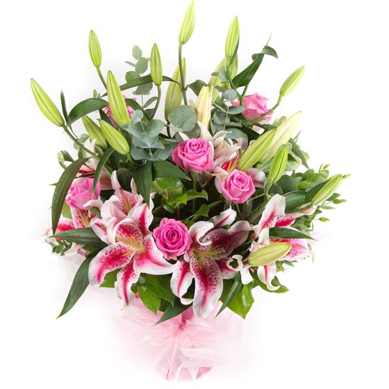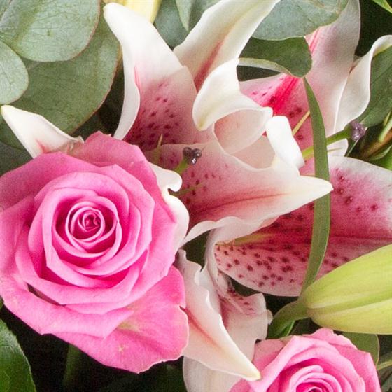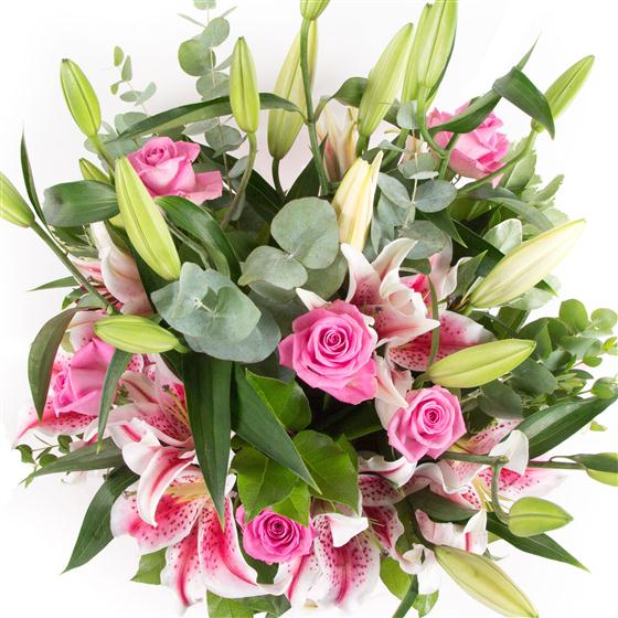 Pink roses and pink stargazer lilies combined with palm leaves and eucalyptus create a pretty array that is a joy to the senses.