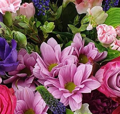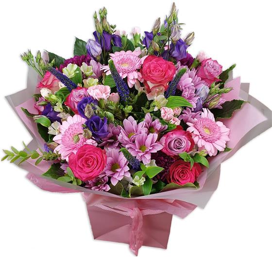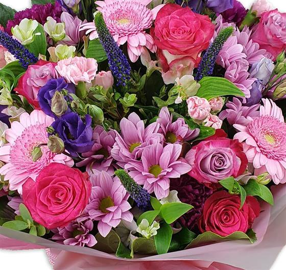 Design includes pink and cerise roses, soft pink gerbera, lilac and blush chrysanthemums, purple lisianthus, delicate veronica, seasonal filler flowers and fresh green foliage, brought together in a full, textured bouquet bursting with colour, movement and cheerful charm.