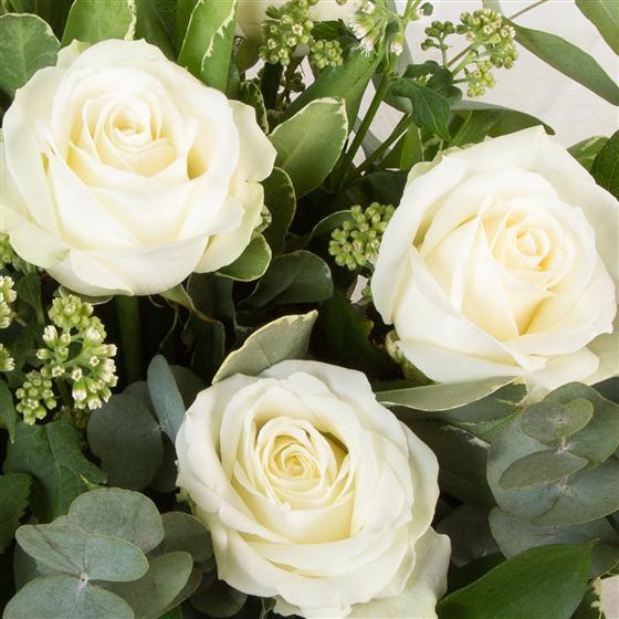 Six long stemmed white roses mingled with mixed foliage presented in water.