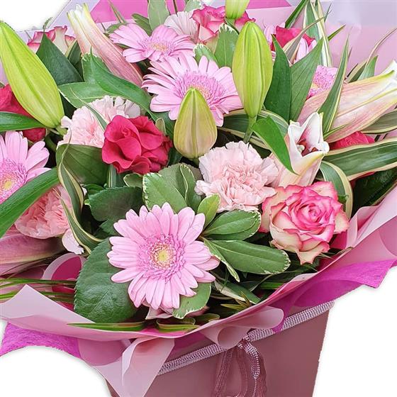 A fresh pink-toned bouquet designed with gerbera daisies, roses, carnations, unopened lilies and layered green foliage, arranged to give gentle height, soft texture and a bright, contemporary floral look.