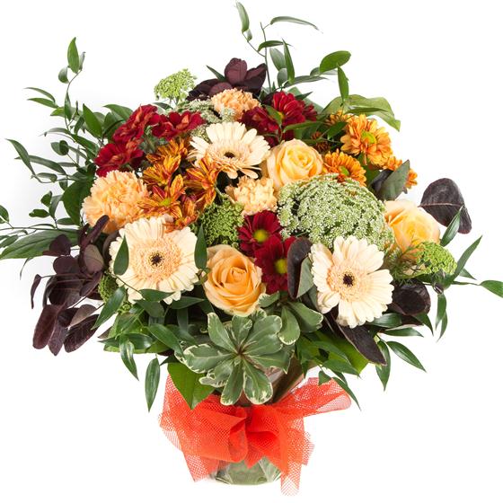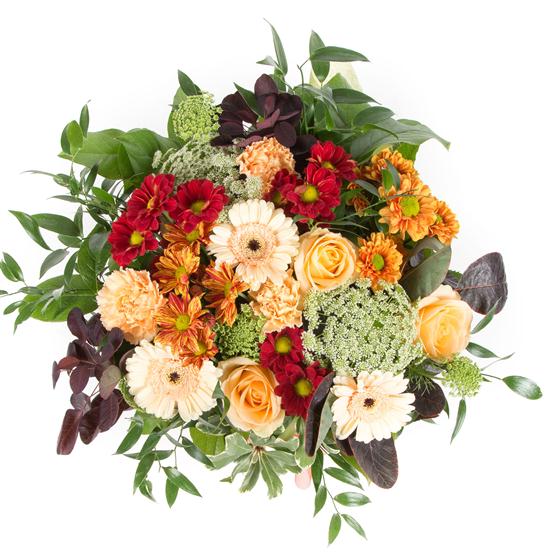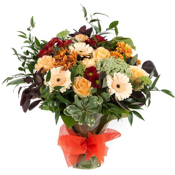 Peaches, rusts and reds combine with autumnal foliage to create this timeless hand-tied bouquet.