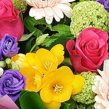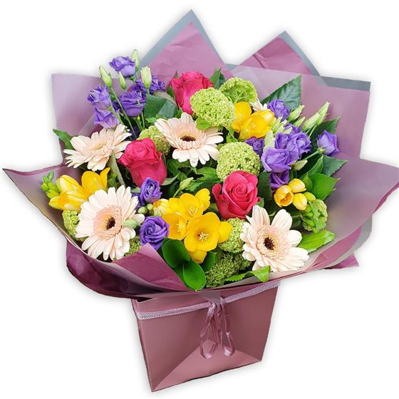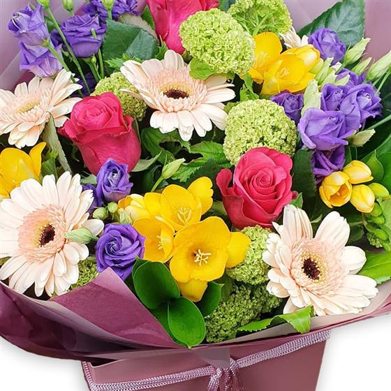 Charming, vibrant hand-tied bouquet featuring fresh hot pink gerberas, sunlit orange gerberas, chartreuse spider mums, lavender lisianthus, yellow freesia, lush botanical greens, gift-wrapped to add joy and elegance to any celebration.