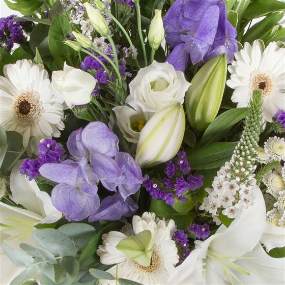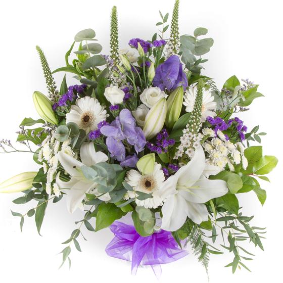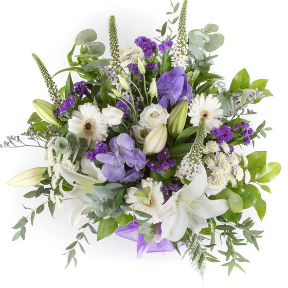 An elegant bouquet of white and purple blooms including scented oriental lilies, statice, limonium and wispy foliage.
