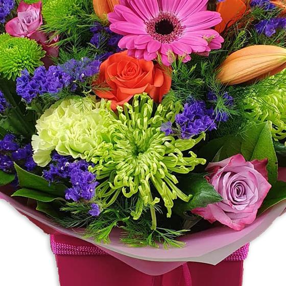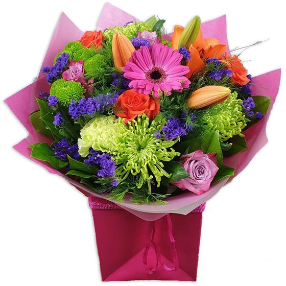 A bold and cheerful flower bouquet combining vibrant pinks, fresh greens and warm orange tones. Designed with gerbera, roses and lilies, finished with textured blooms and foliage for a lively, eye-catching display.