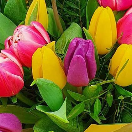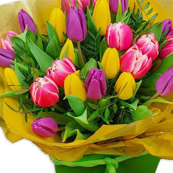 Design includes mixed pink, purple and yellow tulips arranged with fresh green foliage, creating a bright, uplifting bouquet full of spring colour, clean lines and natural freshness.