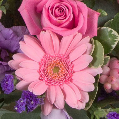 A beautiful, front facing arrangement in bright pinks, striking purples and lilacs.