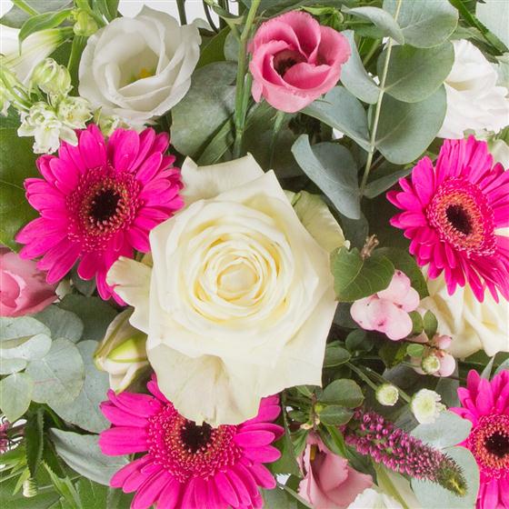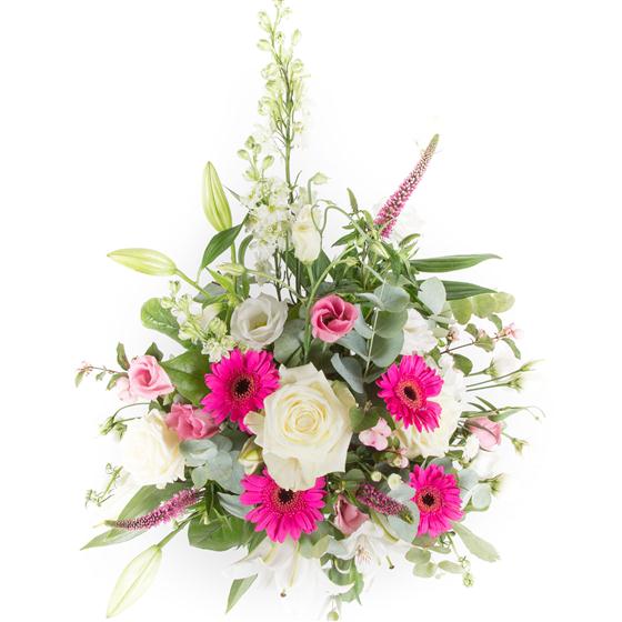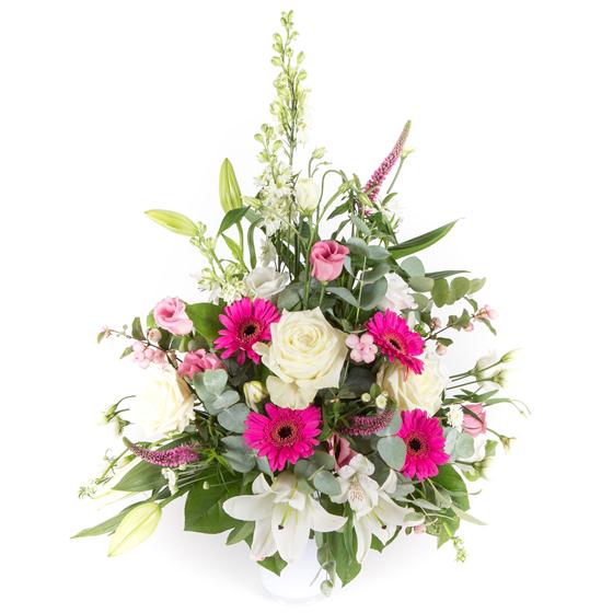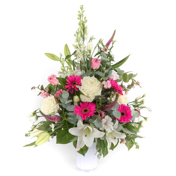 A tall, front facing modern arrangement in cerise and contrasting whites, including scented lilies, roses and veronica.