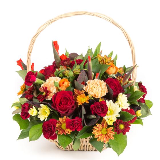 A rich mix of deep reds, rusts and golds. Including roses, spray carnations, alstromeria and chrysanthemums.
