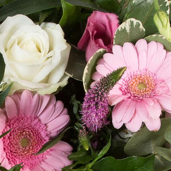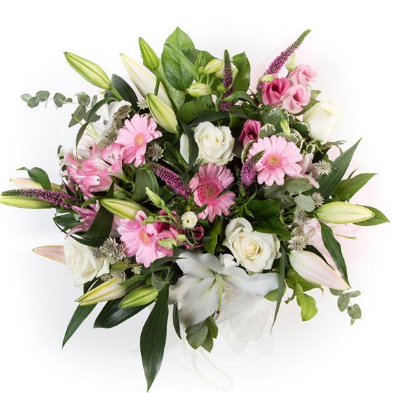 A scented bouquet including oriental lilies, veronica, roses, gerberas and lisianthus presented in a matching gift bag.