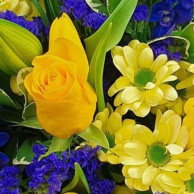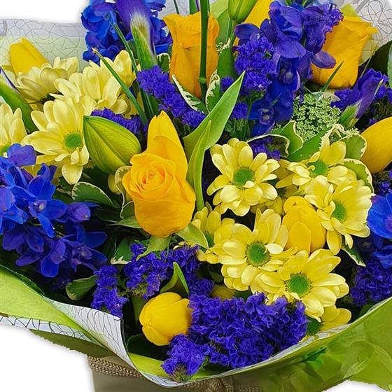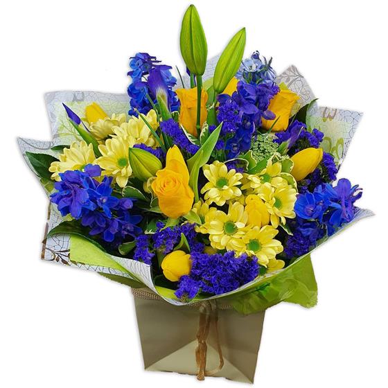 Design includes yellow roses, yellow chrysanthemum blooms, blue delphinium, lilac statice, unopened lily buds and fresh green foliage, arranged into a bright bouquet with crisp colour contrast, height and a clean, uplifting feel.