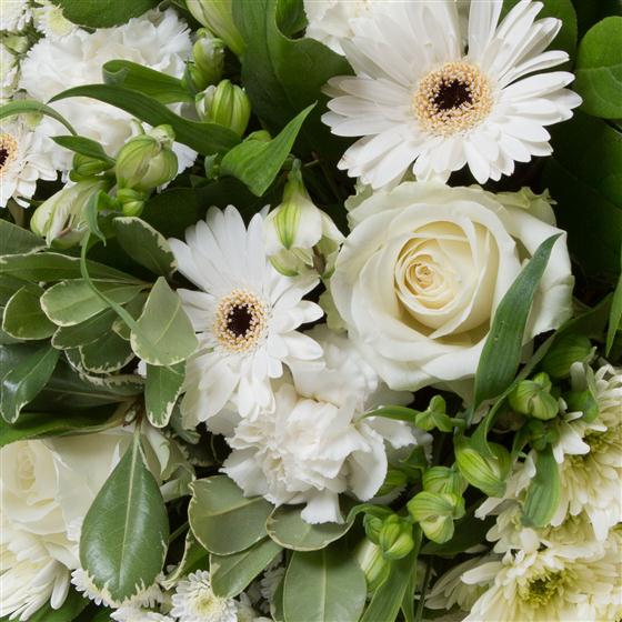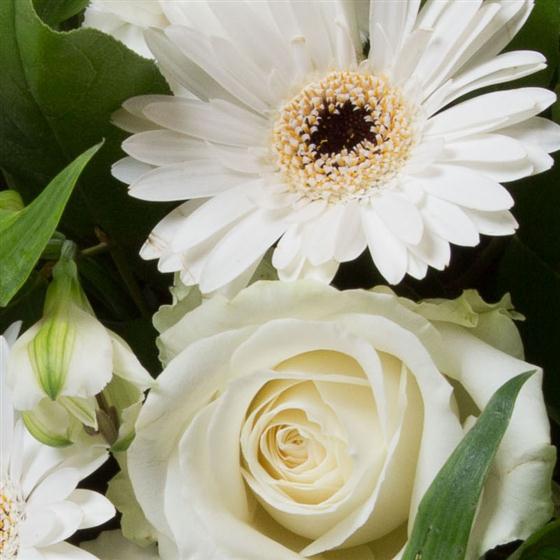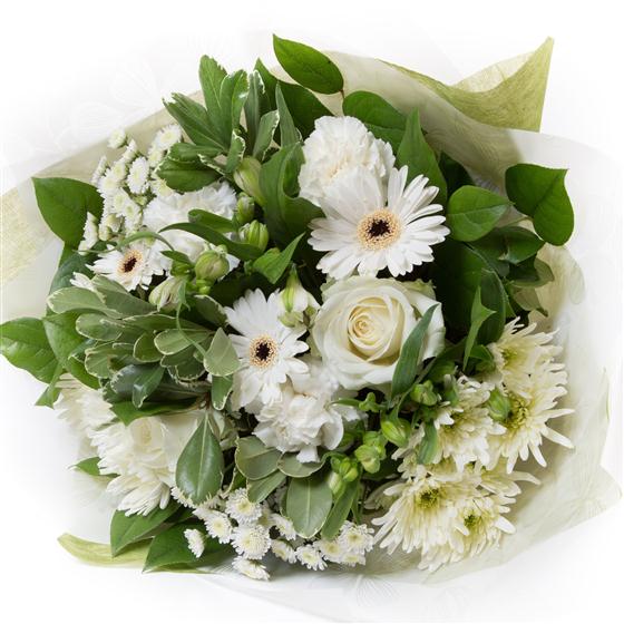A simple hand-tied bunch of cream and white blooms including gerberas, chrysanthemums, carnations and alstromeria.