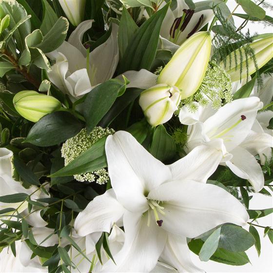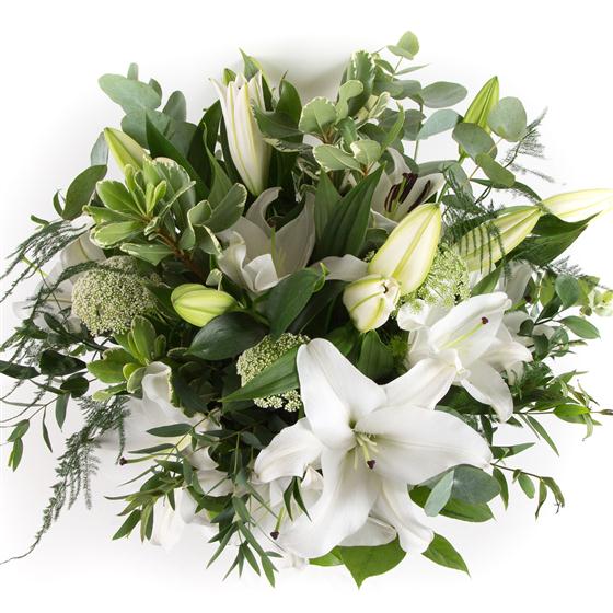 A simple, hand-tied bouquet of highly scented white oriental lilies and foliage.